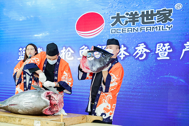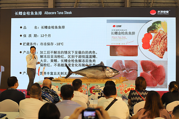 展會(huì)期間,大洋世家還受邀參加了主辦方于8月26在W3館組織的活動(dòng)。當(dāng)日13:00,主題為“大洋世家藍(lán)鰭金槍魚解體秀暨產(chǎn)品推介”的活動(dòng)精彩開(kāi)演,公司工作人員現(xiàn)場(chǎng)先是推介講解了金槍魚魚排、金槍魚罐頭、蝦滑等產(chǎn)品特質(zhì),隨后對(duì)一條重達(dá)近200斤的冰鮮藍(lán)鰭金槍魚進(jìn)行了解體秀表演,現(xiàn)場(chǎng)人氣大量聚集,大家爭(zhēng)先恐后,切身感受這別具風(fēng)格的精彩時(shí)刻。